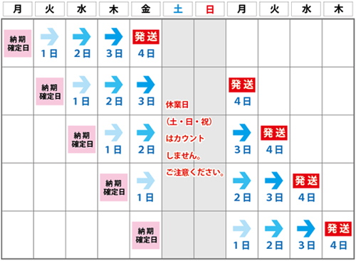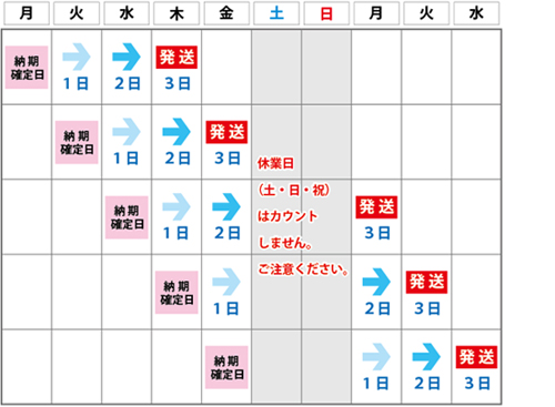 ※祝日がある場合は、その日数分だけ発送日がずれますのでご注意ください。
