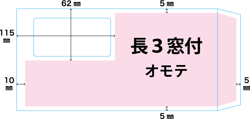 窓を左上として見た場合、上・下・右(ベロ)は5mm、左は10mmの余白が必要です。窓の部分左から115mm、上から61mmも印刷できません。