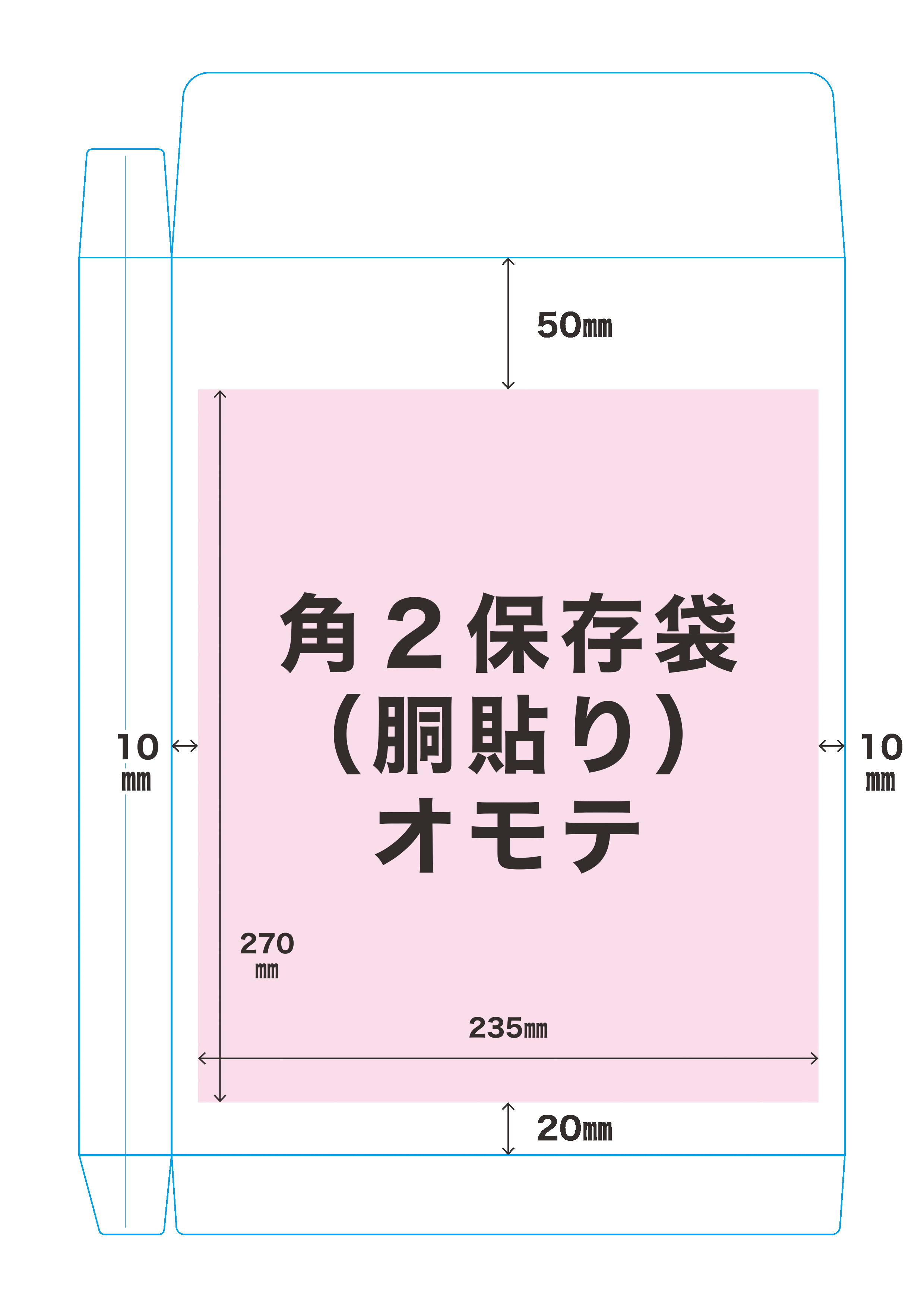 上(ベロ)は50mm、左右は10mm、下は20mmの余白が必要です。(詳細は下図を参照ください)